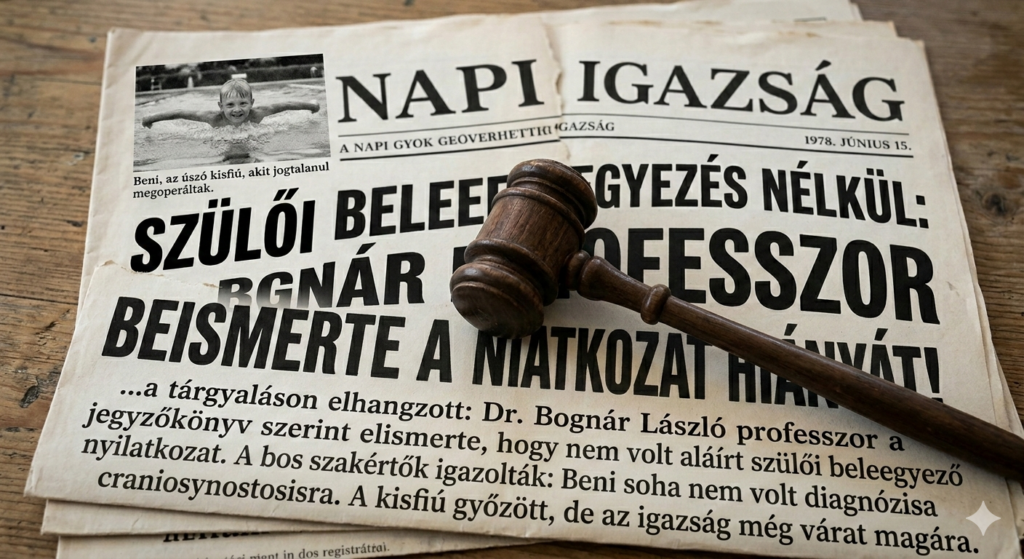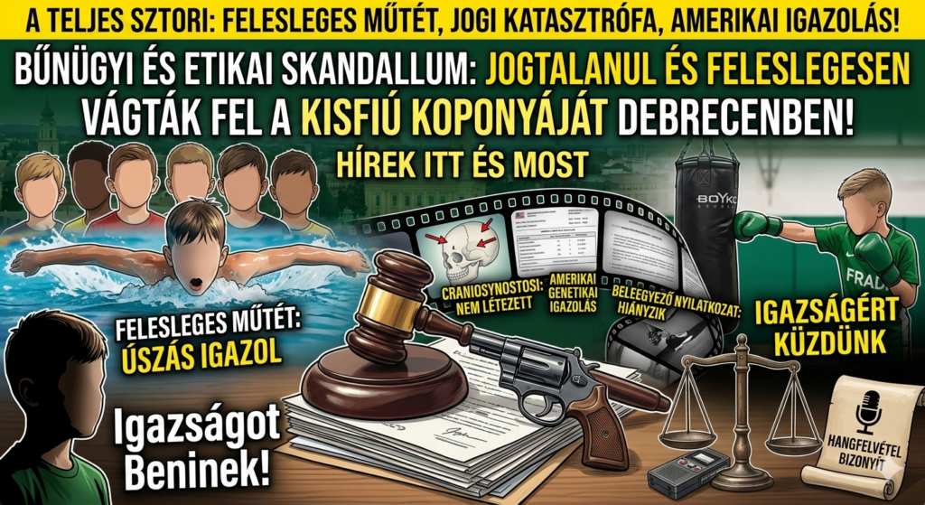 A világhírű bostoni klinikák szakértői (neurológusok, idegsebészek és genetikusok) a vizsgálatok után egyértelműen kijelentették: Beninek soha nem volt szüksége koponyaműtétre!A diagnózis, amire a debreceni professzor hivatkozott (koponyavarrat-elcsontosodás), a bostoni vérvételek és vizsgálatok alapján nem létezett. A kisfiúnak egy ritka genetikai adottsága van, amit Bostonban azonnal felismertek – de Debrecenben inkább a szikét választották.„Megskalpoltam” – Cinizmus a tárgyalóterembenA család számára a bírósági szembesítés nem csak a papírok hiánya miatt volt fájdalmas.A vallomások során elhangzott, hogy a professzor etikátlanul és érzéketlenül fogalmazott a beavatkozással kapcsolatban: kijelentette, hogy „megskalpolta” a gyermeket. Ez a mondat, párosulva azzal a hangfelvétellel, ahol az orvos beismeri, hogy nem tudja mi a baja a gyereknek, de ő „csak operálni tud”, hűen tükrözi a család által átélt tragédiát.Beni győzelme:Úszik, boxol és küzd!Bár jogtalanul és feleslegesen végeztek rajta életveszélyes beavatkozást, Beni minden nap rácáfol az orvosi tévedésekre.