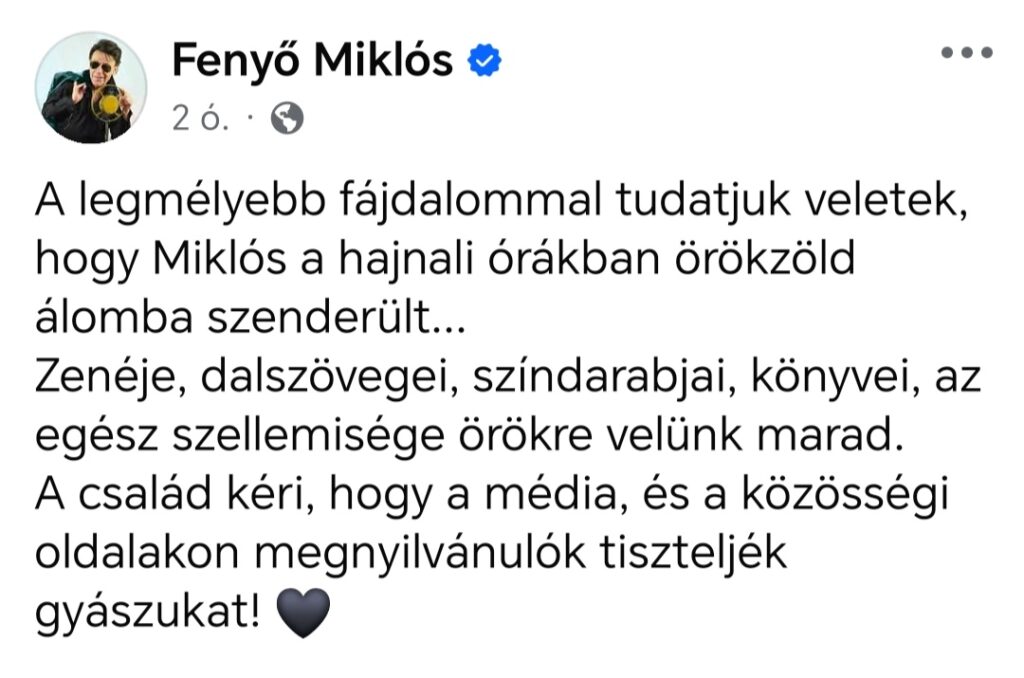 Szombat hajnalban 78 éves korában elhunyt Fenyő Miklós, a Hungária együttes ikonikus frontembere és a hazai rock & roll korszak meghatározó alakja. A szomorú hírt a zenész hivatalos közösségi oldalán tették közzé, amely a rajongók és művésztársak körében azonnal mély megrendülést váltott ki.A legmélyebb fájdalommal tudatjuk veletek, hogy Miklós a hajnali órákban örökzöld álomba szenderült… Zenéje, dalszövegei, színdarabjai, könyvei, az egész szellemisége örökre velünk marad. A család kéri, hogy a média, és a közösségi oldalakon megnyilvánulók tiszteljék gyászukat
