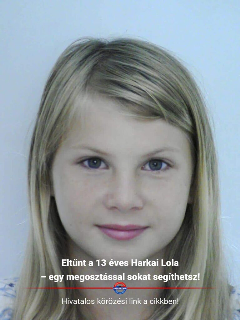 Harkai Lola 2012-es születésű, magyar állampolgárságú fiatal lány. Pontos ruházata az eltűnésekor nem ismert, de a hatóságok minden apró információt várnak, amely segíthet a nyomára bukkanni.Aki a lány hollétével vagy tartózkodási helyével kapcsolatban bármilyen információval rendelkezik, hívja a kapitányságot a 06-34/517-777-es telefonszámon.Bejelentés tehető továbbá:a nap 24 órájában elérhető, 06-80-555-111-es Telefontanú zöldszámán,illetve a 112-es, díjmentes segélyhívó számon.