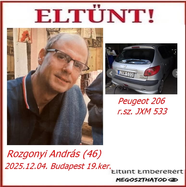 December 4-én András unokatestvérem elment otthonról Peogeot 206 ezüst szinű JXM 533 rsz. gèpkocsijával és azóta sem ment haza. A kapcsolatot nem lehet felvenni vele. Semmilyen életjelet nem ad magáról.